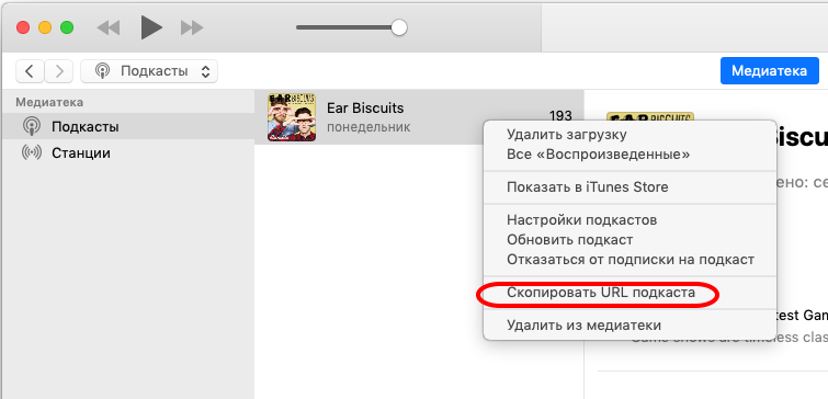 Нажмите правой кнопкой на нужный подкаст и выберите Скопировать URL подкаста.