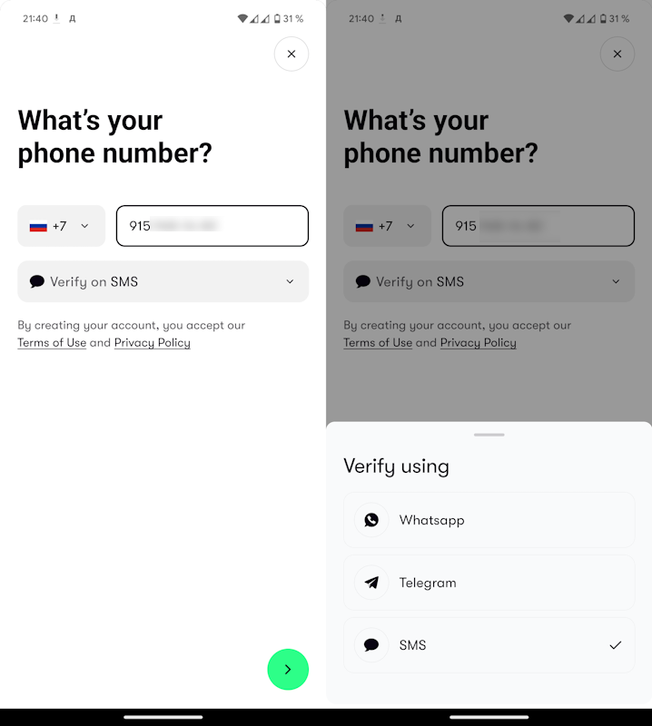 Чтобы создать аккаунт в PEXX, нужно подтвердить мобильный номер телефона. Отправка СМС на российские номера отключена, поэтому вам понадобится иностранный номер либо аккаунт в Whatsapp или Telegram с привязкой к РФ номеру. В моём случае активация через Whatsapp прошла без каких-либо проблем.