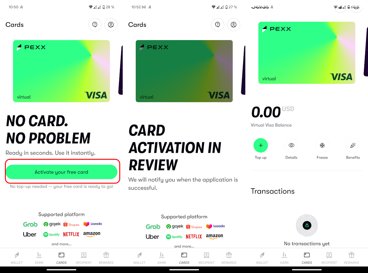 PEXX предлагает три вида карт. Для большинства из нас подойдёт виртуальная Visa или MasterCard, выпуск которой будет бесплатным. Для этого на экране выбора карты нужно нажать кнопку Activate your free card, и через некоторое время в вашем распоряжении будет свежая карточка.