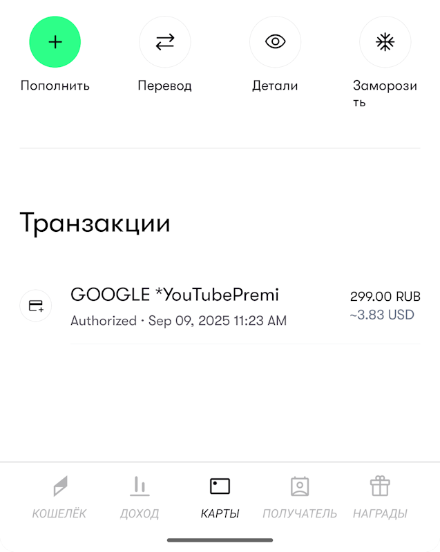 Данные выпущенной карты можно увидеть здесь же — на вкладке Cards. Здесь отображается баланс, транзакции и реквизиты. При необходимости карту можно заморозить.