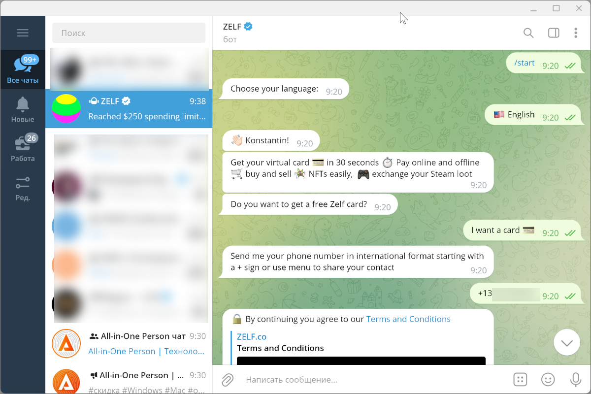 После того как вы получили номер, можно установить приложение Zelf на Android или iOS, либо воспользоваться ботом в одном из мессенджеров: Telegram, WhatsApp, Discord, F**k Messenger.
