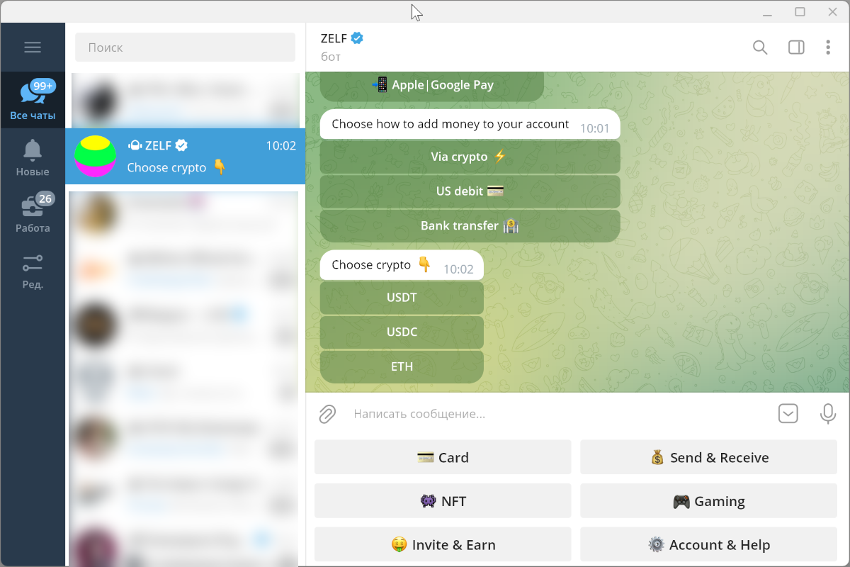В случае с криптовалютой поддерживаются: USDT, USDC и ETH. При первом пополнении Zelf создаст для вас личный кошелёк, куда прямым переводом по адресу вы сможете отправить деньги. Минимальная сумма в этом случае составляет $5.