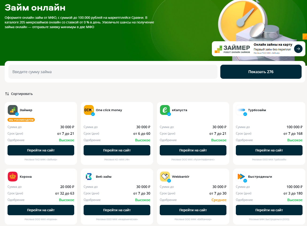 Узнать про лучшие МФО можно на сайте Сравни.ру. Все организации, представленные сервисом, лицензированы Центробанком России. Предусмотрены народные топы, которые составляются по отзывам пользователей.