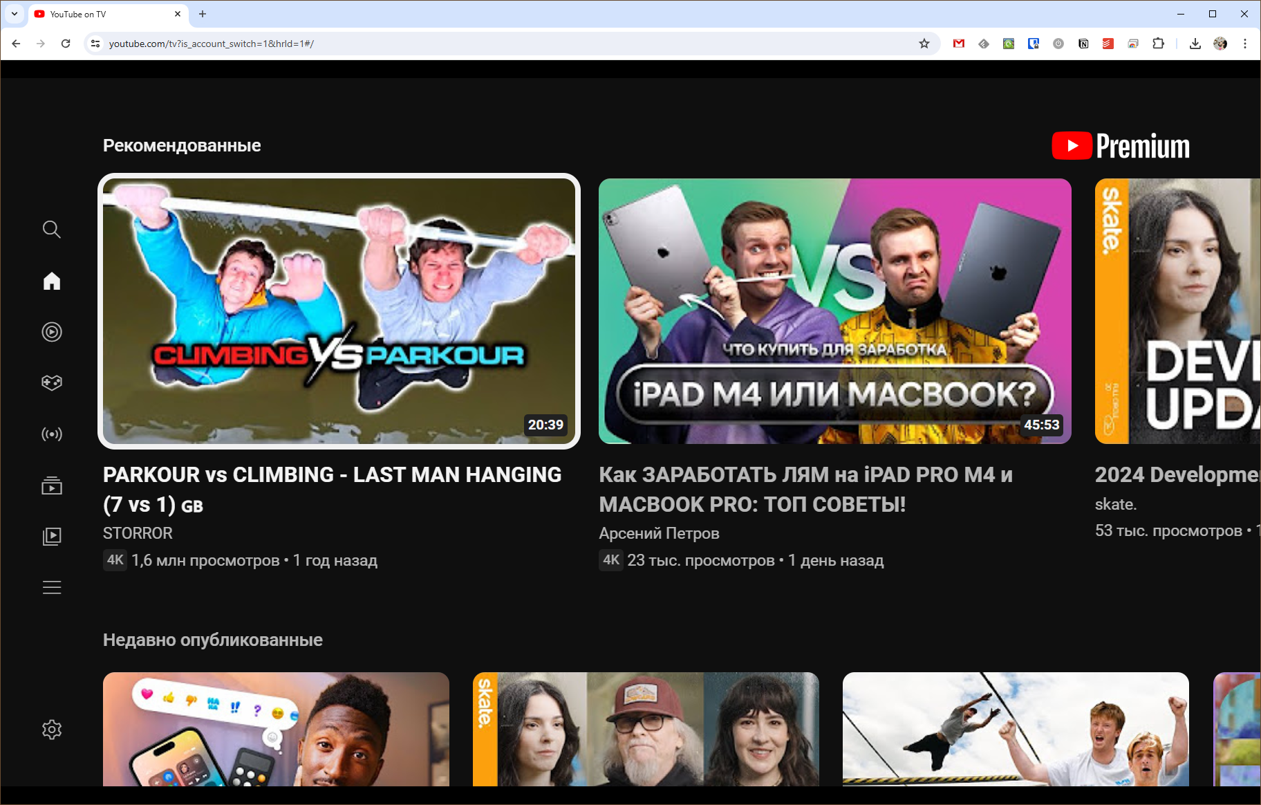 Если вы хотите перейти на аналогичный дизайн, но на компьютере, у вас ничего не получится. Ссылка для доступа к YouTube TV https://www.youtube.com/tv переадресует вас на обычный YouTube. Чтобы избежать этого, достаточно установить расширение для Google Chrome под названием Youtube TV On PC.