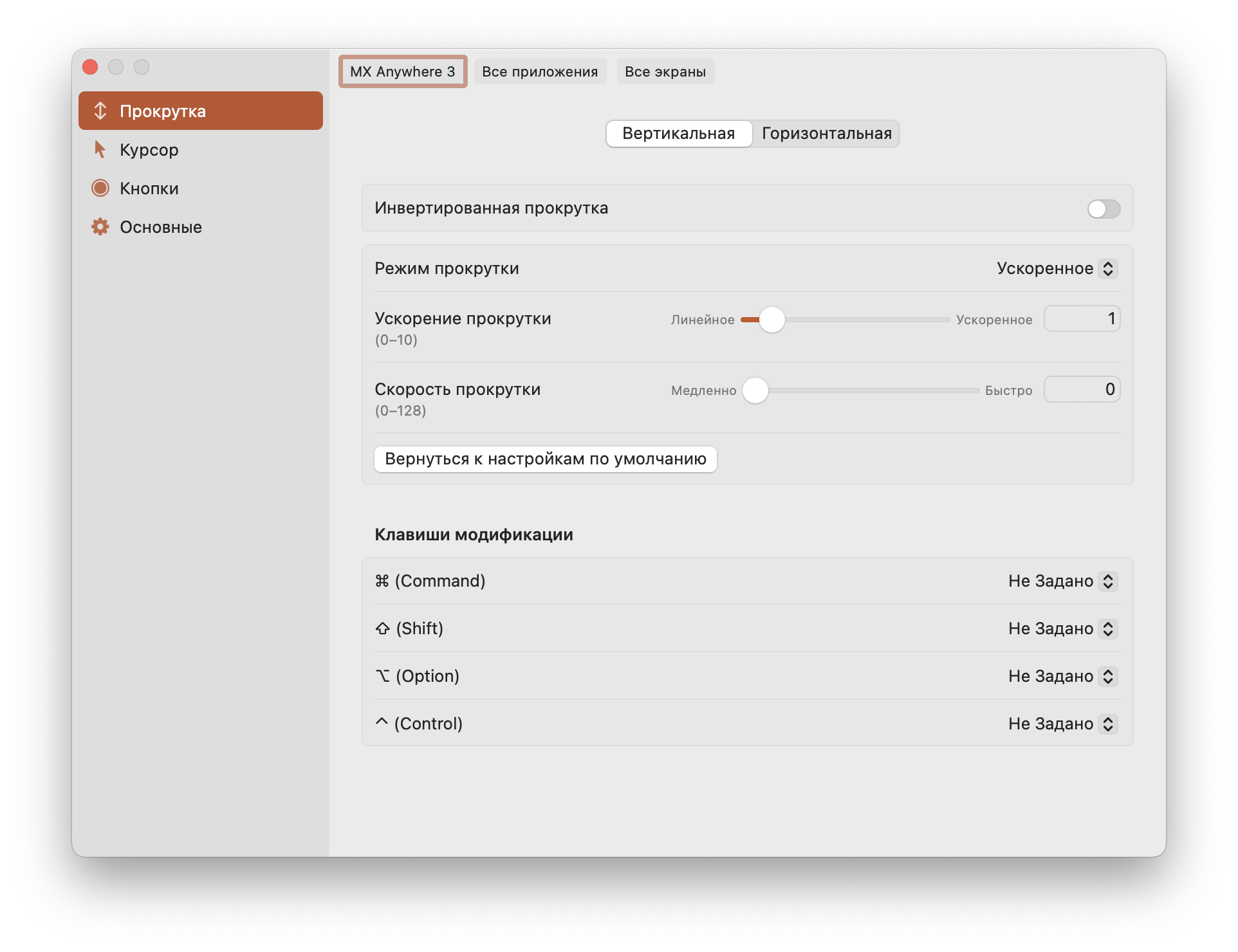 В разделе Прокрутка вы можете настроить инвертированную прокрутку, добавить ускорение или замедление, а также указать клавиши модификаторы.