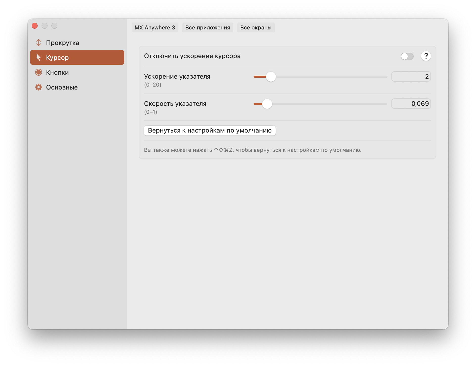 Аналогично работает раздел Курсор. Но из опций здесь лишь ускорение или замедление перемещения курсора.