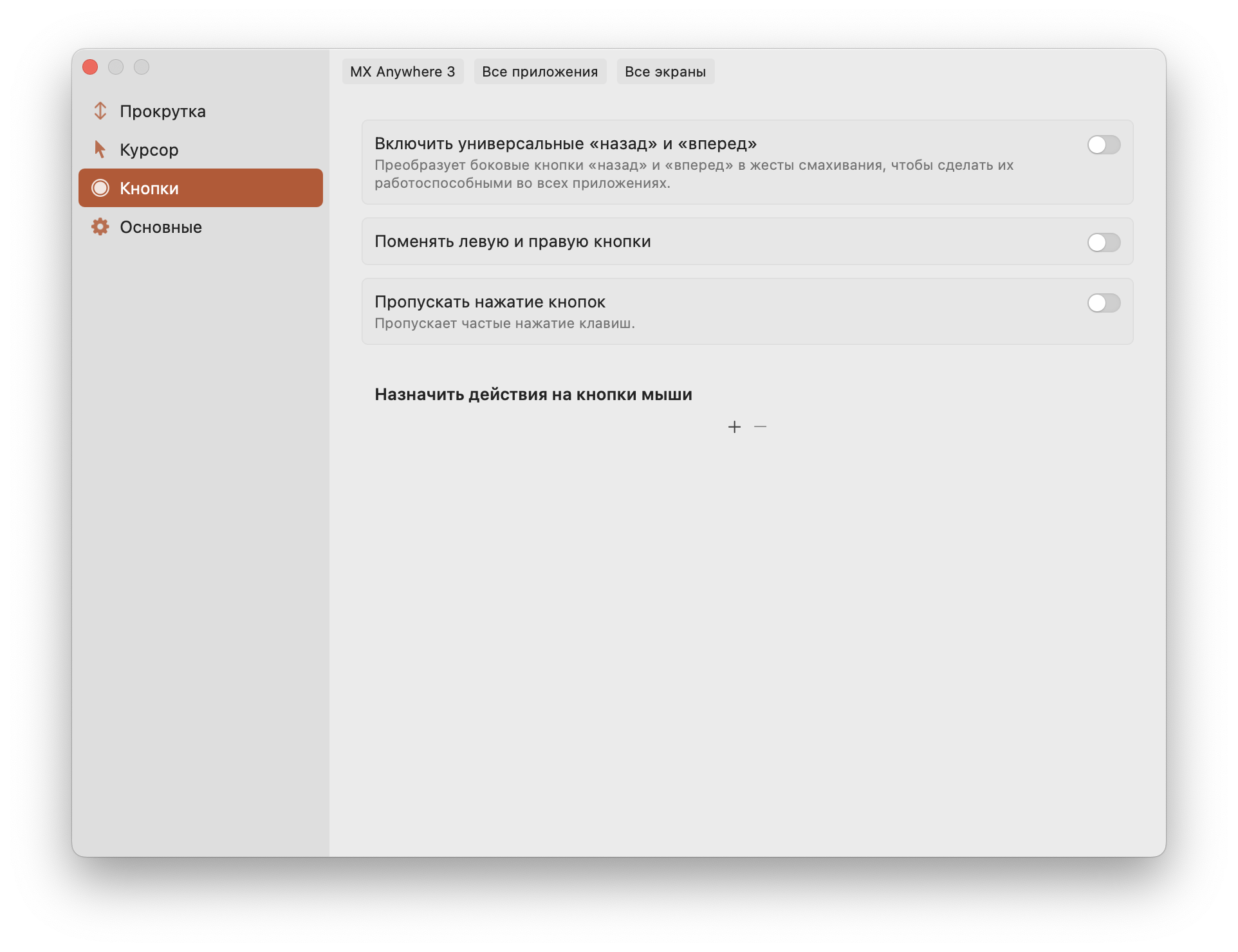 Последний раздел Кнопки позволяет перенастроить поведение функциональных клавиш вашей мыши.