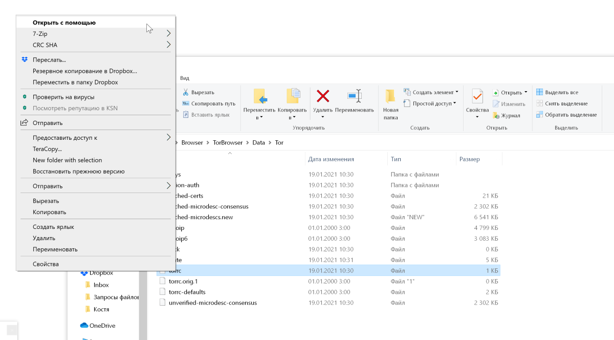 Пройдите по пути: Browser > TorBrowser > Data > Tor. Вы увидите файл torrc.