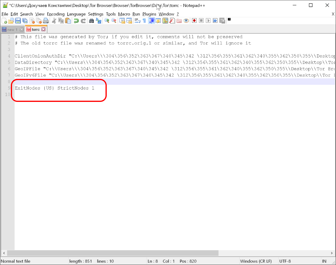 В самом низу впишите следующее: ExitNodes {US} StrictNodes 1.