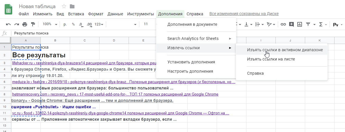 После установки дополнения в соответствующем меню появится пункт Извлечь все ссылки. Можно выбрать обработку ссылок только внутри выделенного диапазона или на всём листе.