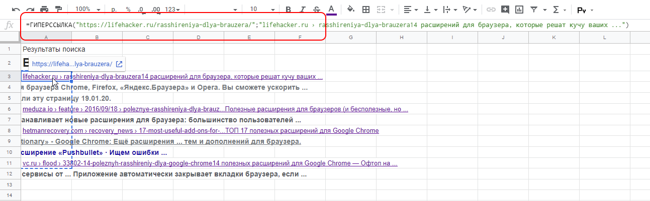EXTRACT URLs извлекает ссылки из Google таблицы и преобразует их в формулу HYPERLINK.