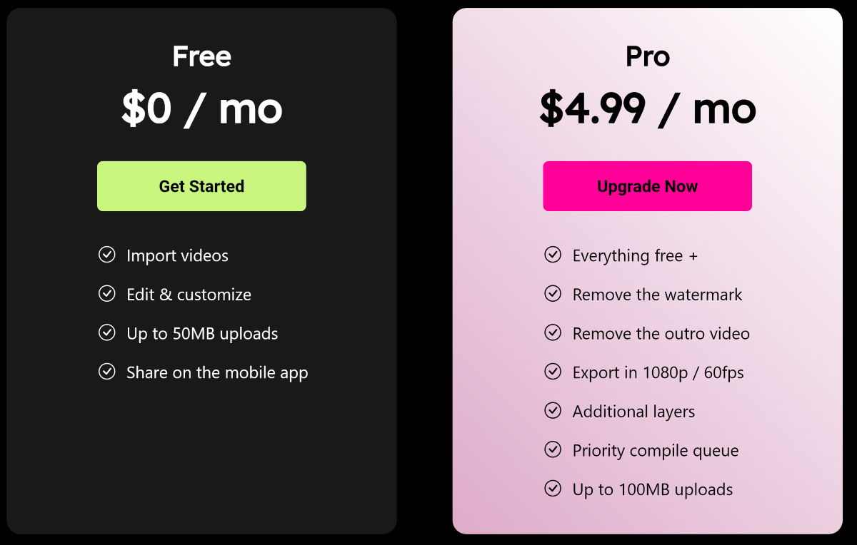 В платной версии Crossclip можно убрать водяной знак и outro сервиса и добавить любое количество слоёв. Также увеличивается лимит на загружаемый файл до 1000 Мб и появляется возможность экспорта видео в 1080p 60 FPS.