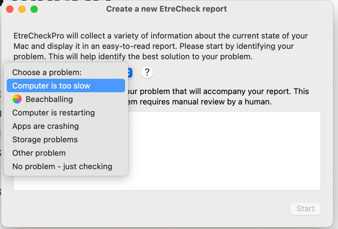 При первом запуске EtreCheck спросит вас о том, какую же задачу вы хотите решить. Набор небольшой: компьютер медленно работает, перезагружается, приложения вылетают, проблемы с хранилищем или просто праздное шатание.