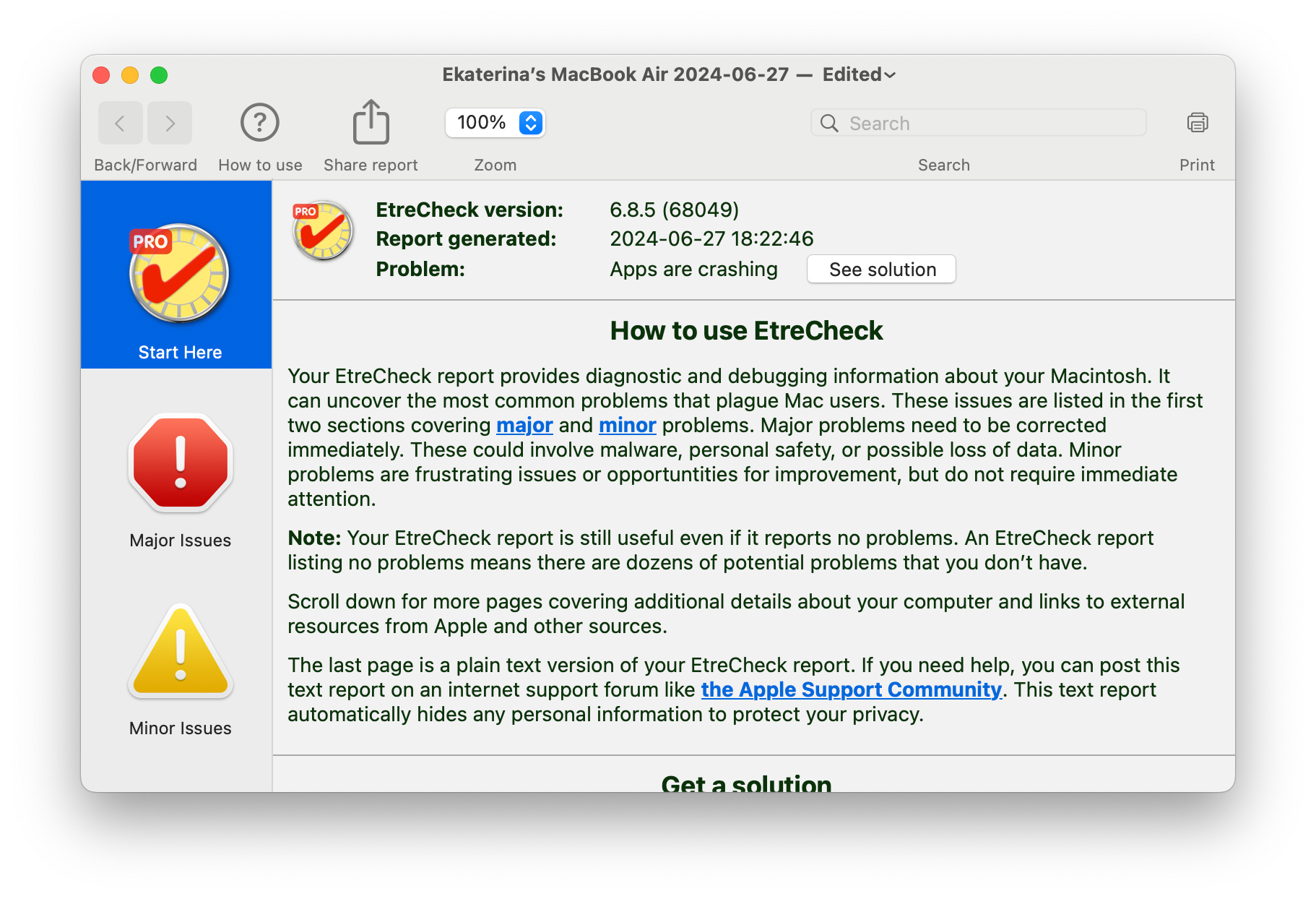 А вот для macOS таких утилит как будто бы и нет, ведь у пользователей этой ОС не бывает проблем. Но я всё же нашёл подобное приложение, которое называется EtreCheck.
