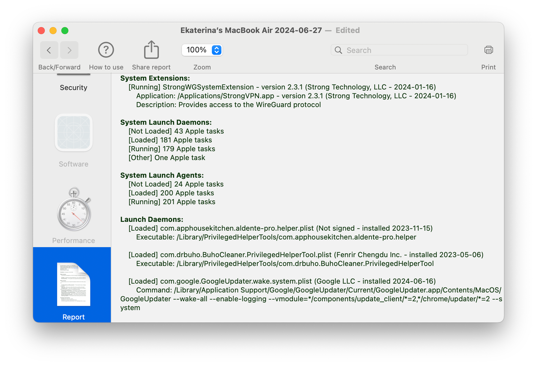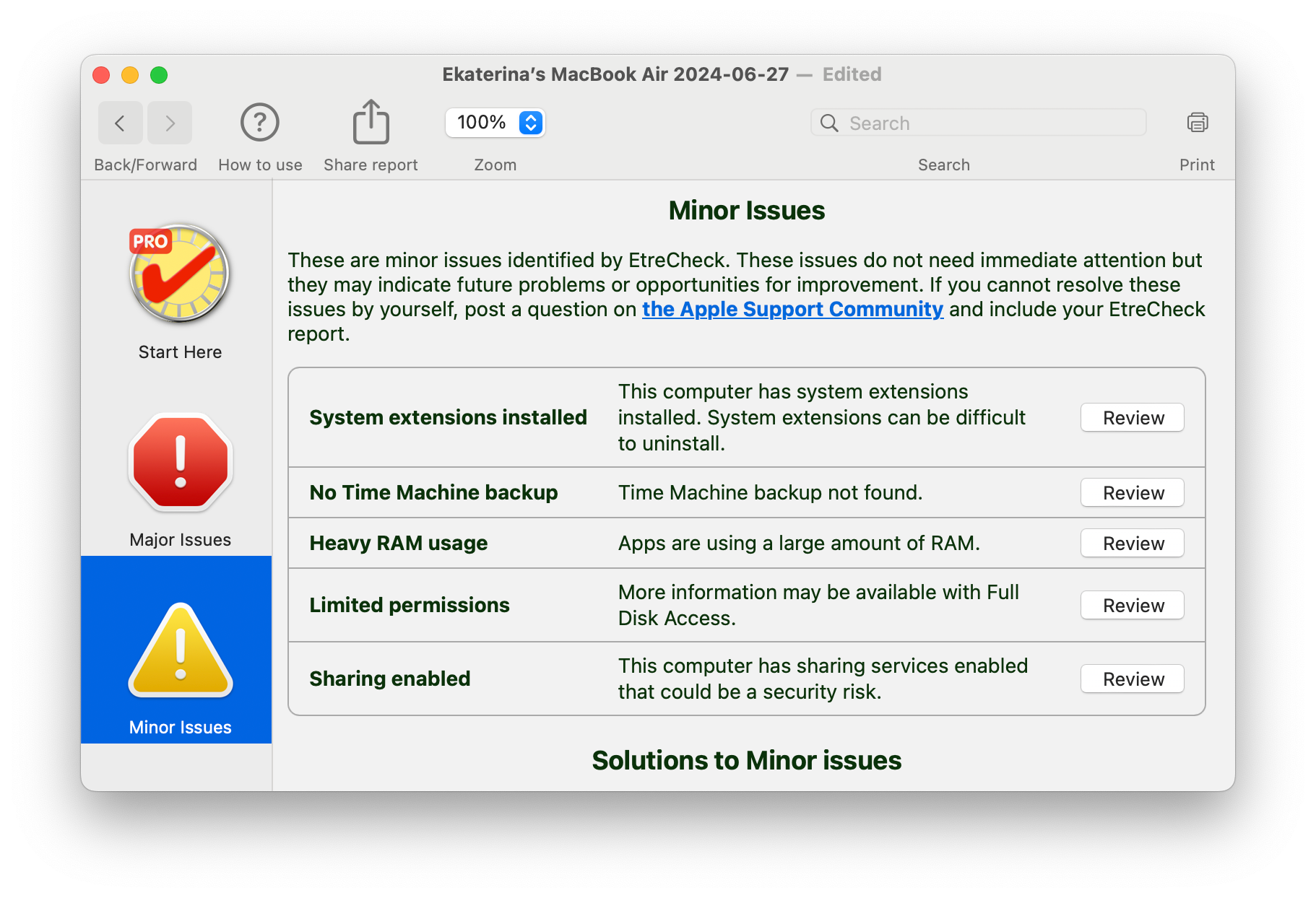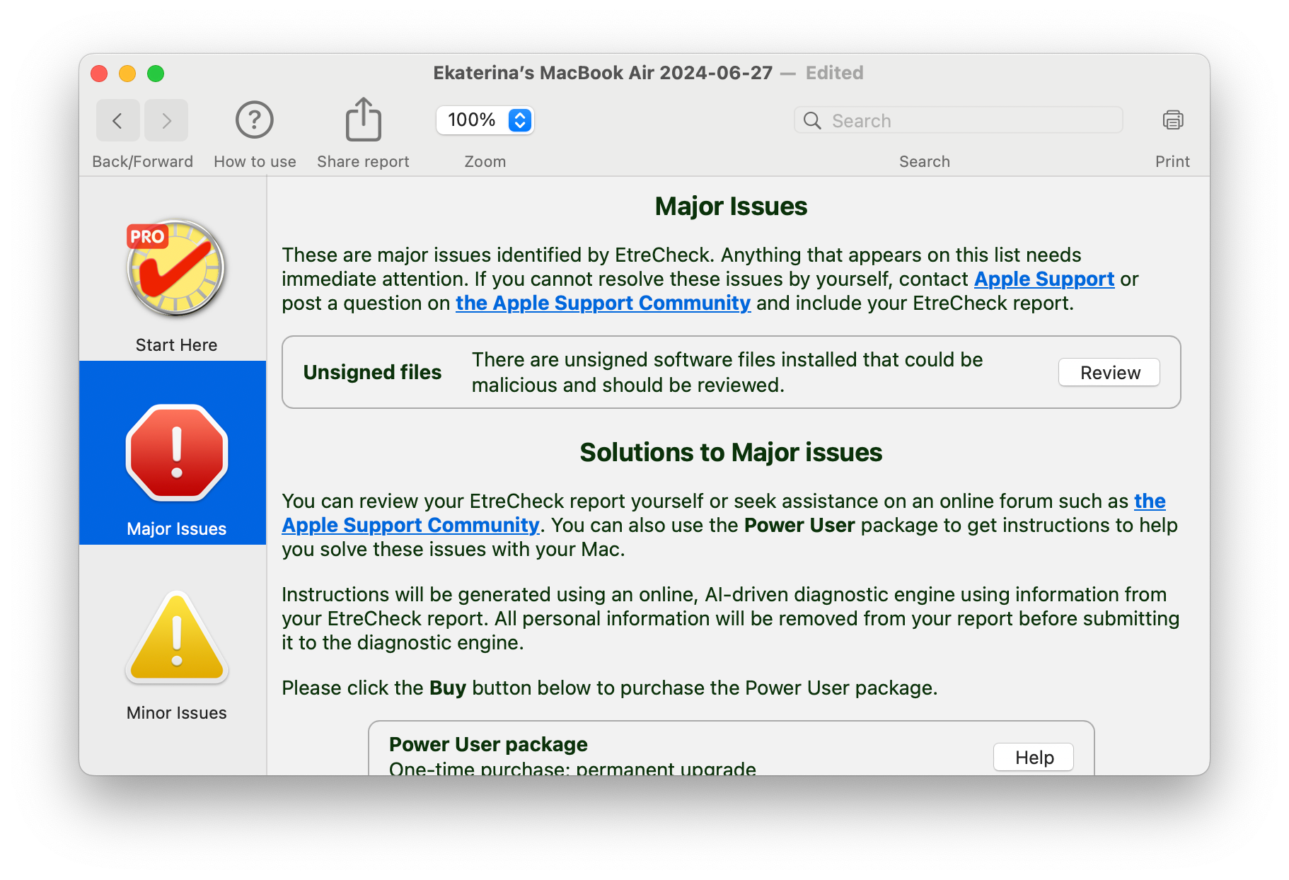 В EtreCheckPro, кроме возможности общения с человеком, скрыты и некоторые разделы отчёта: железо, система, память, сеть, безопасность, софт, производительность.