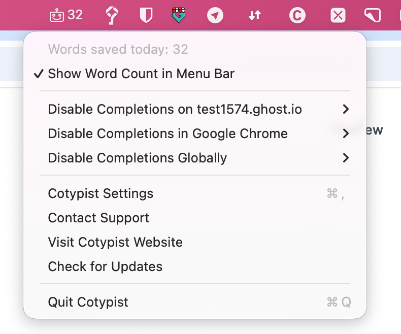 В настройках Cotypist можно отключить подсказки на время, на определённом сайте или для определённого приложения.