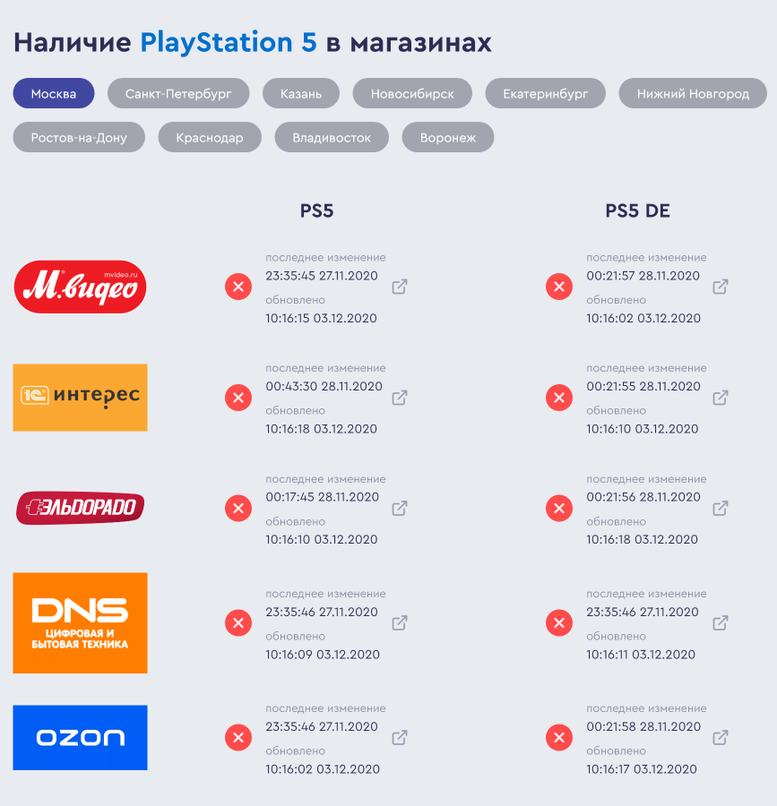 Для последней задачи появились два сайта, которые в реальном времени за вас проверяют доступность PS5 и Xbox Series в популярных интернет-магазинах.