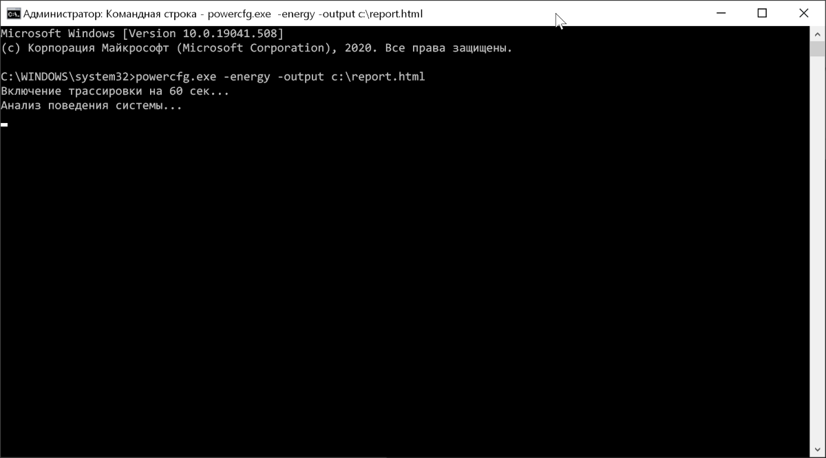 Команду нужно выполнять с правами администратора. Вместо c:\report.html можно указать любой другой путь для сохранения файла отчёта.