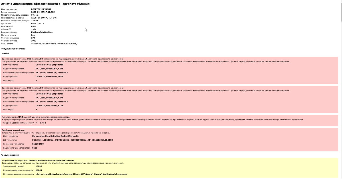 Через несколько минут по указанному пути вы сможете просмотреть готовый отчёт. Красным отображаются ошибки, жёлтым – предупреждения, а белым обычная справочная информация. В конце будут данные о самом аккумуляторе.
