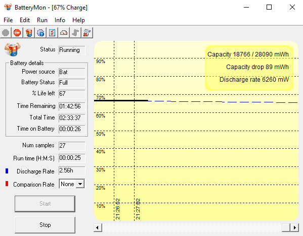 Сразу при запуске утилиты вы увидите главное окно с графом. При нажатии на кнопку Start вы сможете увидеть в реальном времени уровень заряда батареи или источника бесперебойного питания.