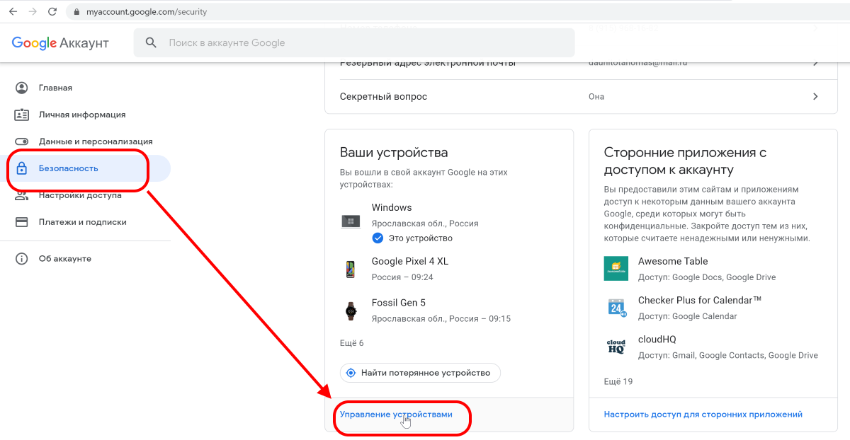 А всё просто. Нужно перейти и авторизоваться (если не) на странице вашего Google-аккаунта. Где перейти в раздел Безопасность и в нём промотать до блока Ваши устройства. Затем нужно нажать кнопку Управление устройствами.