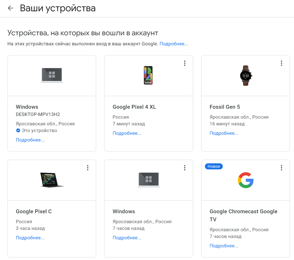 Здесь вы увидите список всех устройств, на которых вы вошли в свой аккаунт Google.