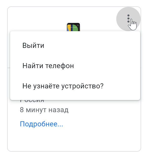 При клике на меню вы сможете выйти удалённо на устройстве из аккаунта, найти устройство (если это смартфон).