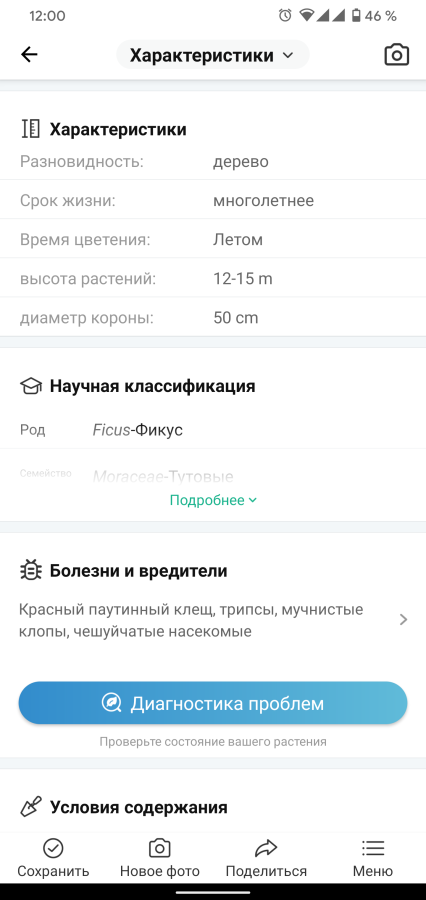 Ещё ниже идёт раздел с описанием потенциальных болезней и вредителей для вашего друга. А так же есть кнопка для диагностики проблем. По ней открывается камера и вы можете сфотографировать болячку цветка, а PictureThis проанализирует насколько всё плохо.
