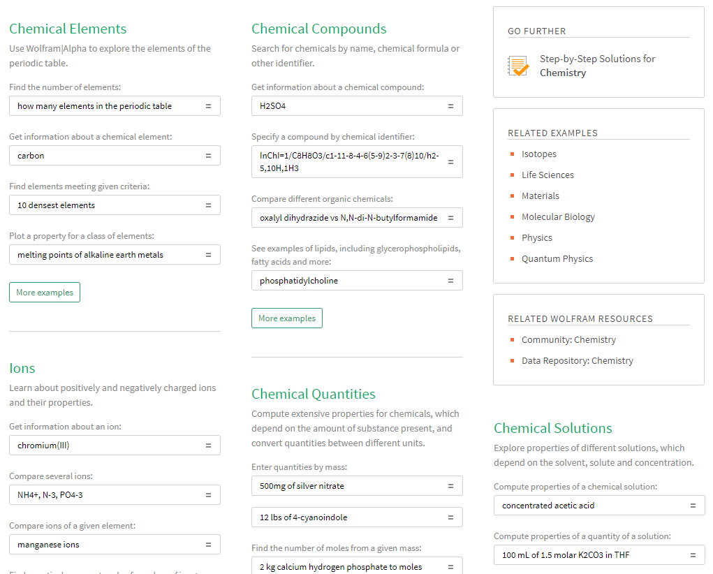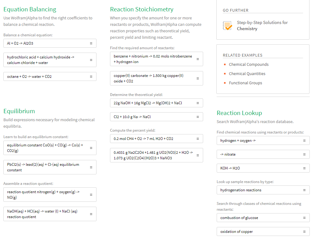 Для решения любых задач по химии можно обратиться к Wolfram|Alpha, где при переходе в соответствующий раздел вас ожидают различные калькуляторы.