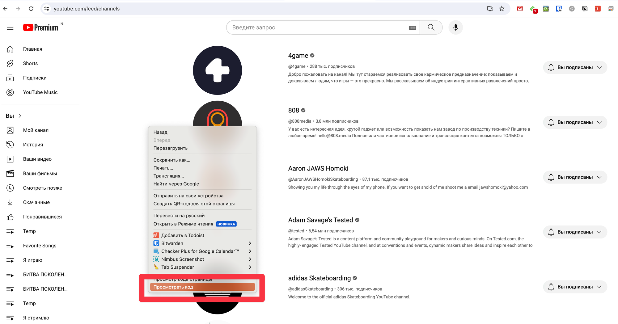 Далее я покажу, как в Google Chrome решить эту задачу, но по аналогии можно воспользоваться любым другим браузером. Для этого нужно перейти на страницу с подписками YouTube, и в контекстном меню выбрать пункт Просмотреть код.