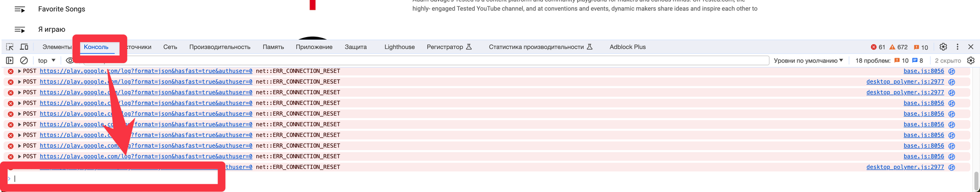 После чего внизу (в зависимости от настроек браузера) откроется консоль разработчика, в которой нужно перейти на вкладку Консоль и поместить курсор внизу в поле ввода.