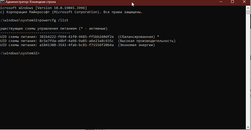 Первым делом выполните команду powercfg /list, которая вернёт список UID профилей энергосбережения.