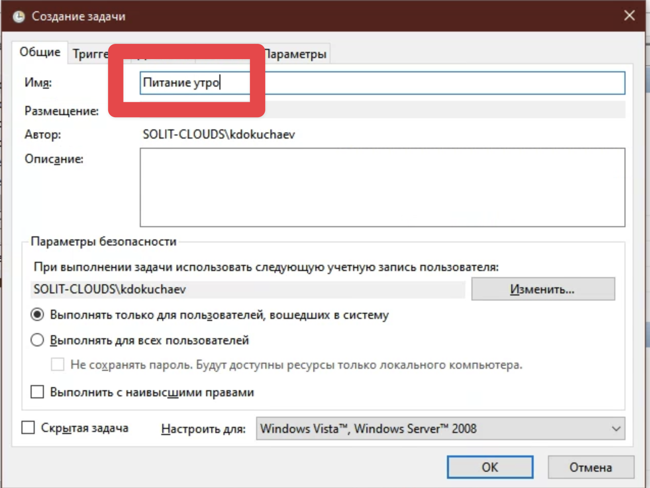 В открывшемся окне для каждого профиля питания нужно выполнить три простых настройки. Во-первых, на вкладке Общие укажите имя задачи.
