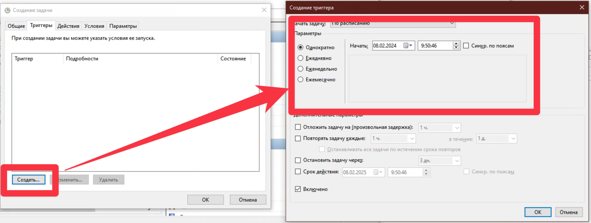 Затем перейдите на вкладку Триггеры, нажмите кнопку Создать и задайте необходимое время для запуска схемы питания. К примеру, ежедневно в 8 утра.