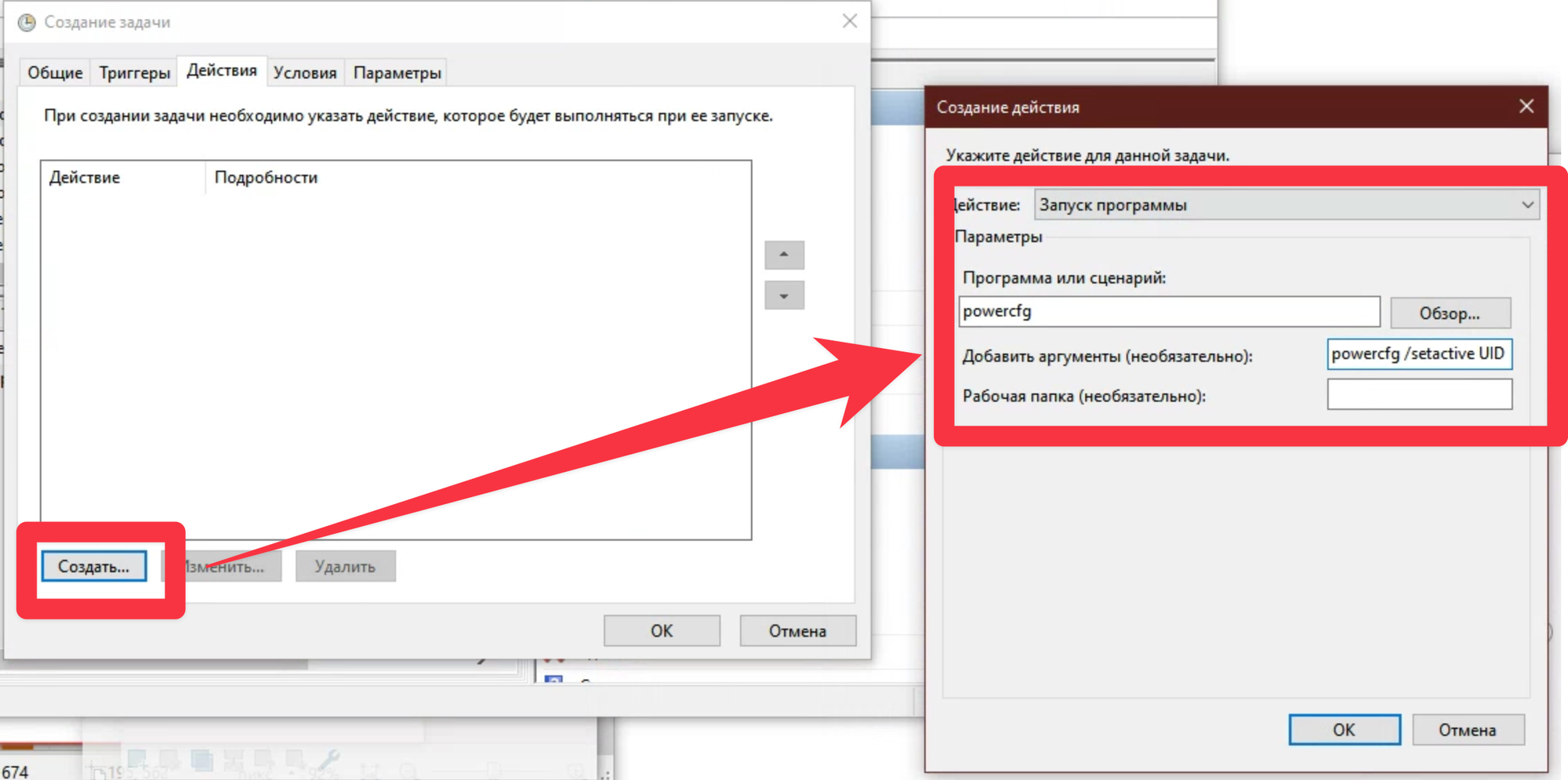 И последний шаг — на вкладке Действия надо нажать кнопку Создать и настроить активацию профиля питания.