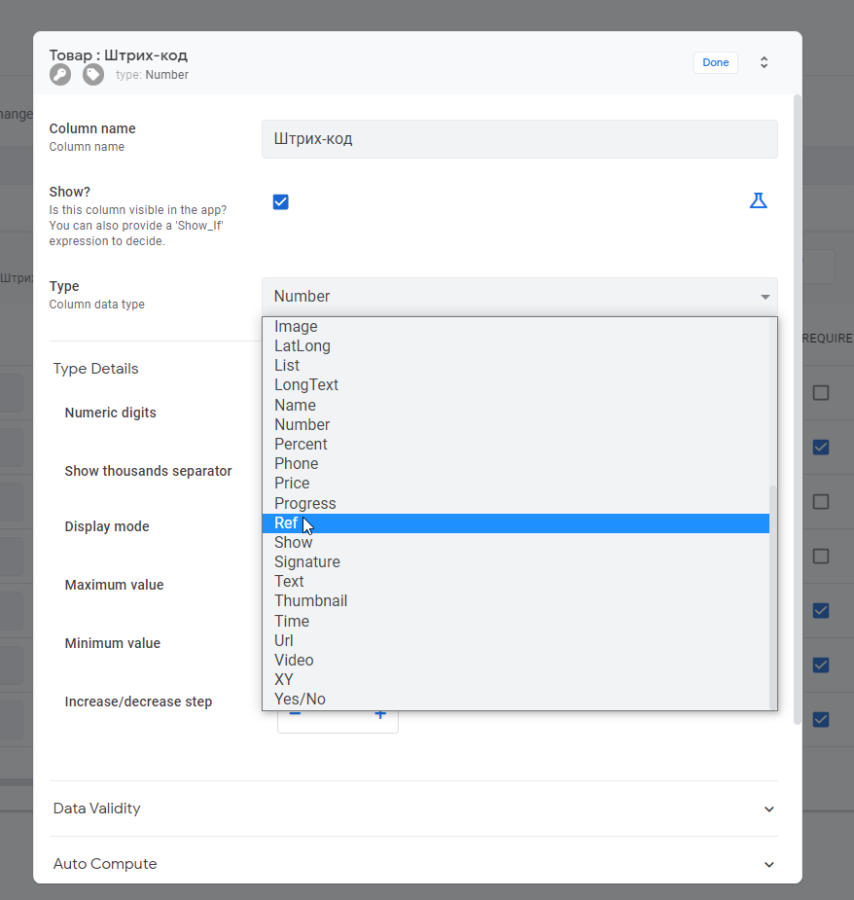 AppSheet может использовать камеру вашего смартфона в качестве сканера штрих-кода. Для этого пройдите в редакторе AppSheet путь Data > Columns и для столбцов «Штрих-код товара» в таблицах «Покупки» и «Продажи» установите параметры searchable и scannable.
