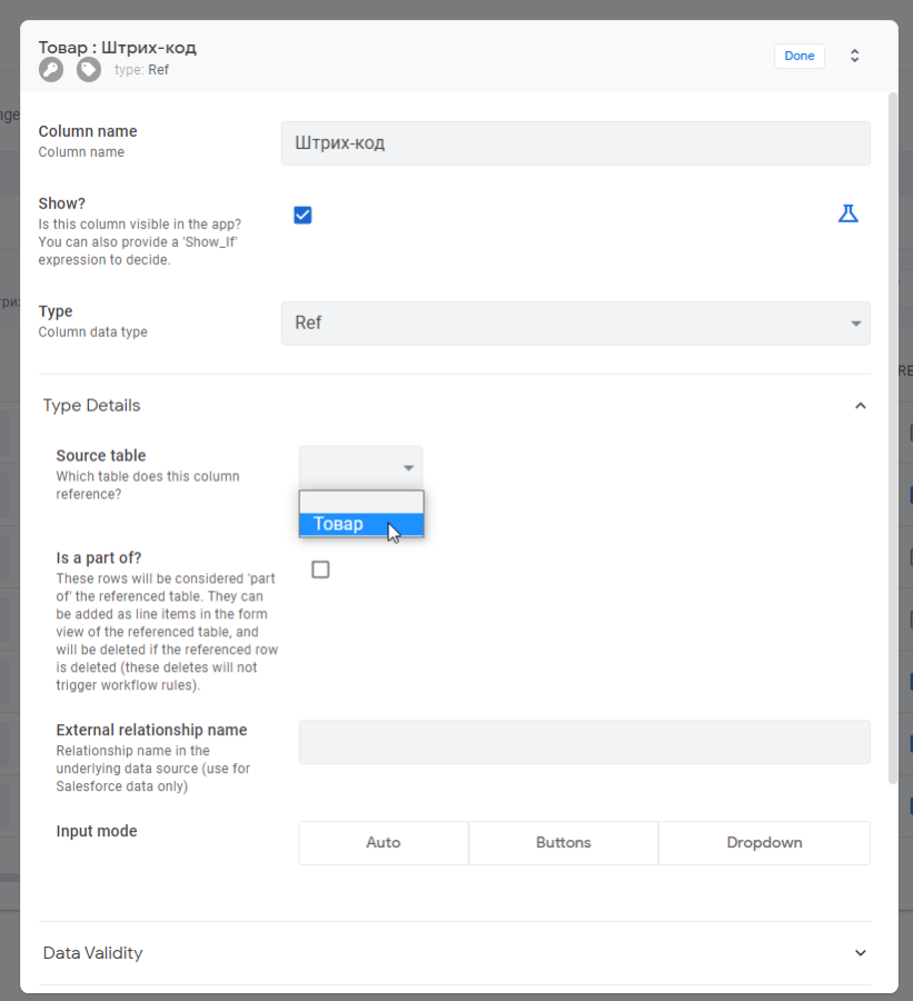 Я связал столбцы «Штрих-код товара» из таблиц «Продажи» и «Покупки» со столбцом «Штрих-код товара» из таблицы «Товары». Для этого я перешёл в Data > Columns > Sales, нажал на Штрих-код товара и выполнил ещё три действия: