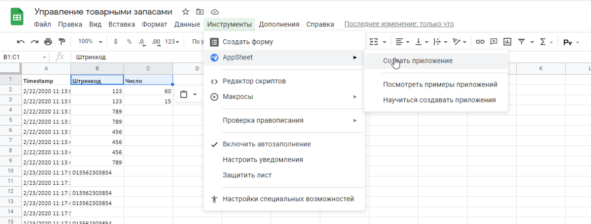 Теперь, когда ваши данные имеют подобающий вид, можете превращать их в приложение. Для этого в Google Таблицах перейдите в Tools > AppSheet > Create an App (Инструменты > AppSheet > Создать приложение).