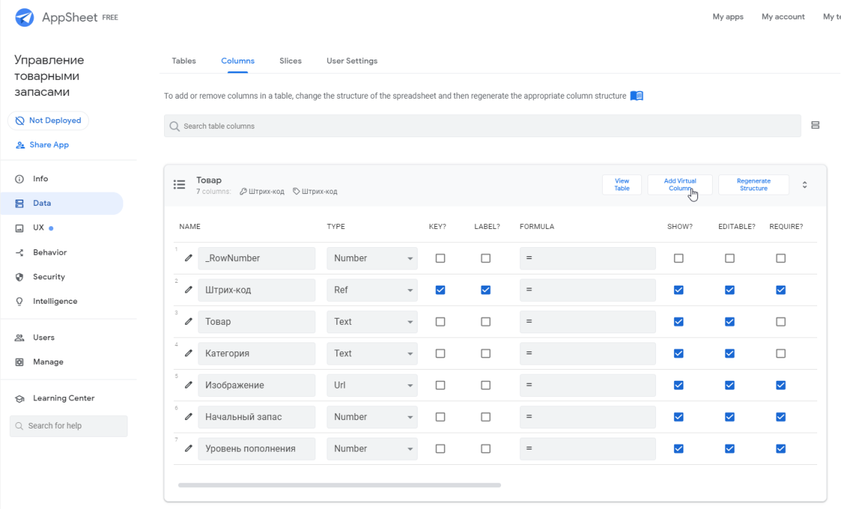 Теперь осталось добавить формулу! Для этого переходим в Data > Columns и в таблице «Товары» выбираем Add virtual column Добавляем во всплывающем окошке такую формулу: