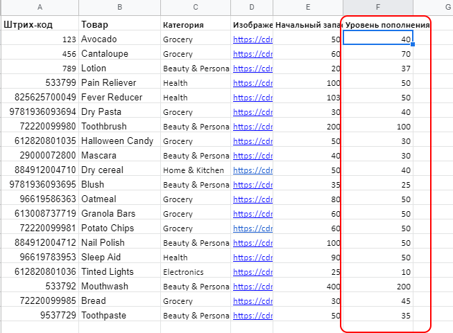 Чтобы увидеть текущий уровень запасов каждого товара в приложении, используется простая формула: