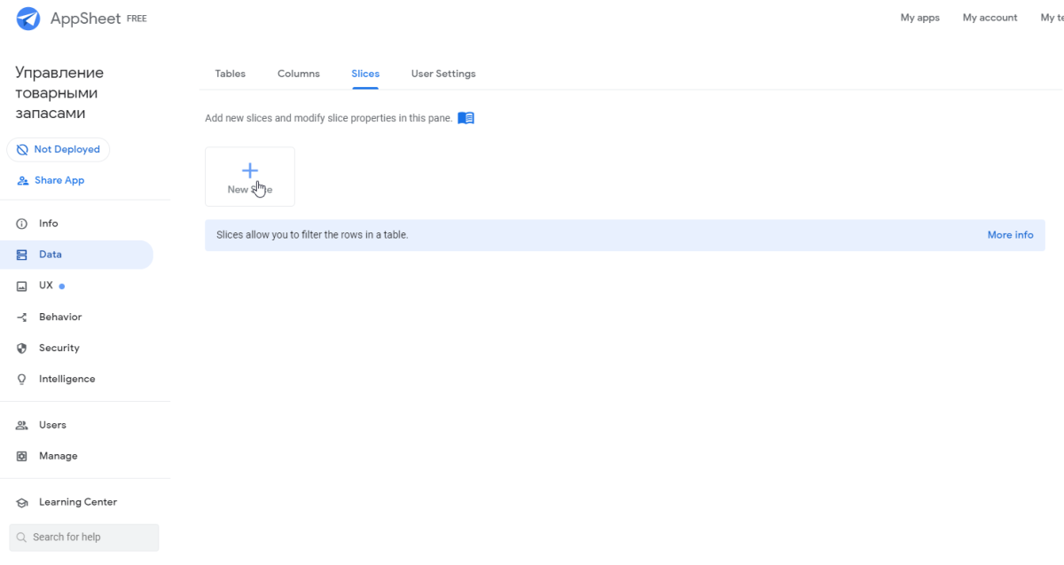 Создаём срез. Для этого переходим в Data > Slices, выбираем Create a slice и подписываем его «Требуется пополнение запасов». Далее устанавливаем Исходную таблицу как Товар и Условие фильтра строки: [Current Stock] <= [Restock Level].