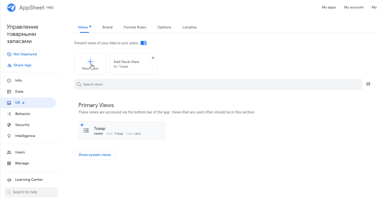 Создаём представление для среза. Проходим по пути UX> Views> New View. Выбираем Требуется пополнение запасов в качестве источника данных и выбираем тип представления (я выбрал Deck).