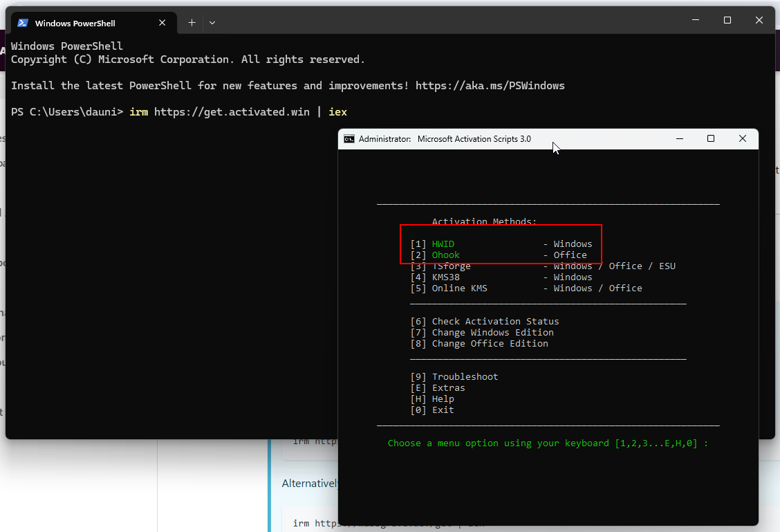 irm https://get.activated.win | iex- Если всё сделано правильно, вы увидите два варианта: