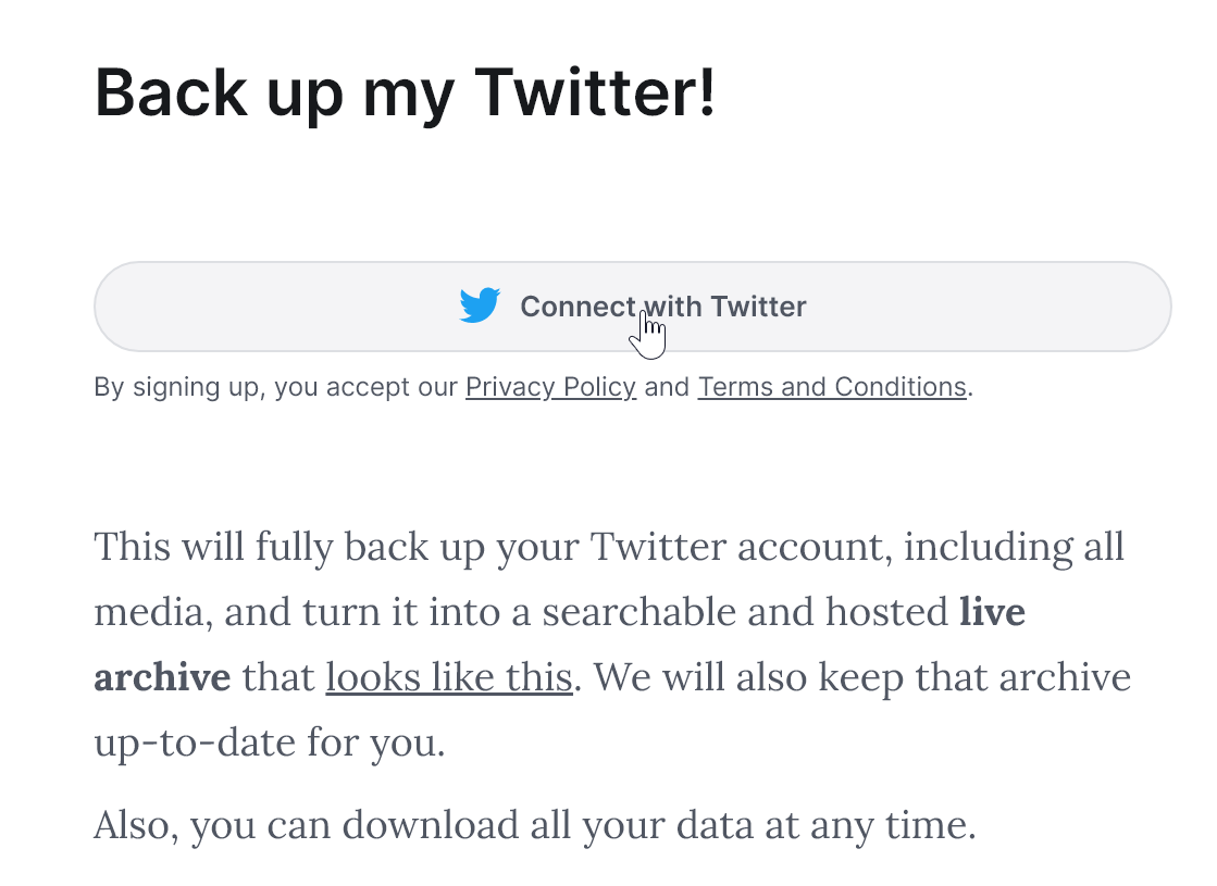 Для этого достаточно перейти на главную страницу Twitter Backup Tool и просто нажать на кнопку Connect with Twitter для подключения к социальной сети.