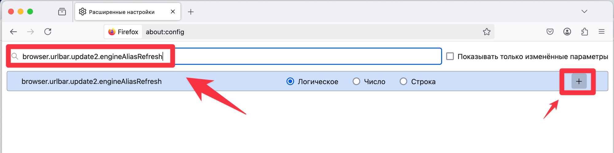 В случае с Firefox всё обстоит немного сложнее. В адресной строке наберите about:config для открытия настроек, а затем в поиске укажите browser.urlbar.update2.engineAliasRefresh и нажмите на кнопку плюсик для добавления параметра.