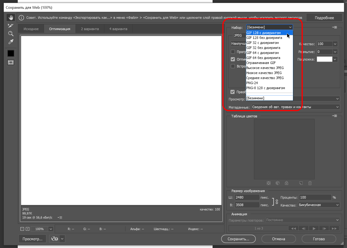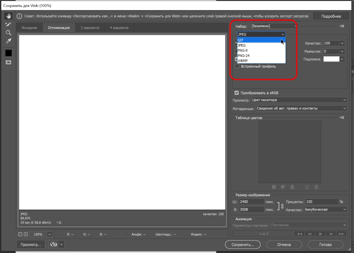 Затем в выпадающем списке настроек выберите тип GIF-а. Если у вас гиф с градиентами, выберите Dithered GIF (GIF с дизерингом), чтобы не было бандинга (цветные полосы). Если ваше изображение перенасыщено сплошными цветами, можете отказаться от дизеринга, выбрав No Dither (без дизеринга).