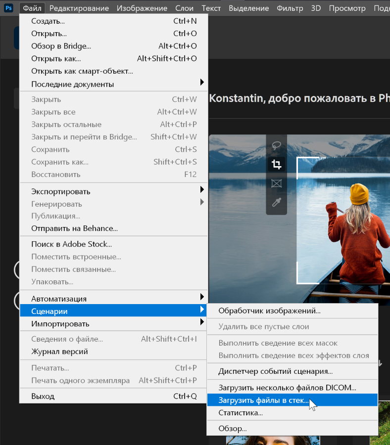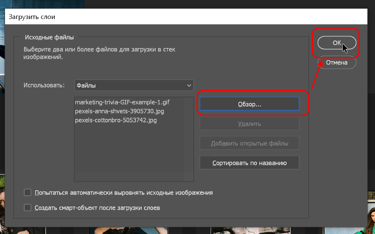 Для начала соберите все имеющиеся изображения в отдельной папочке. Нажмите File > Scripts > Load Files Into Stack (Файл > Сценарии > Загрузить файлы в стек), чтобы закинуть их в программу.