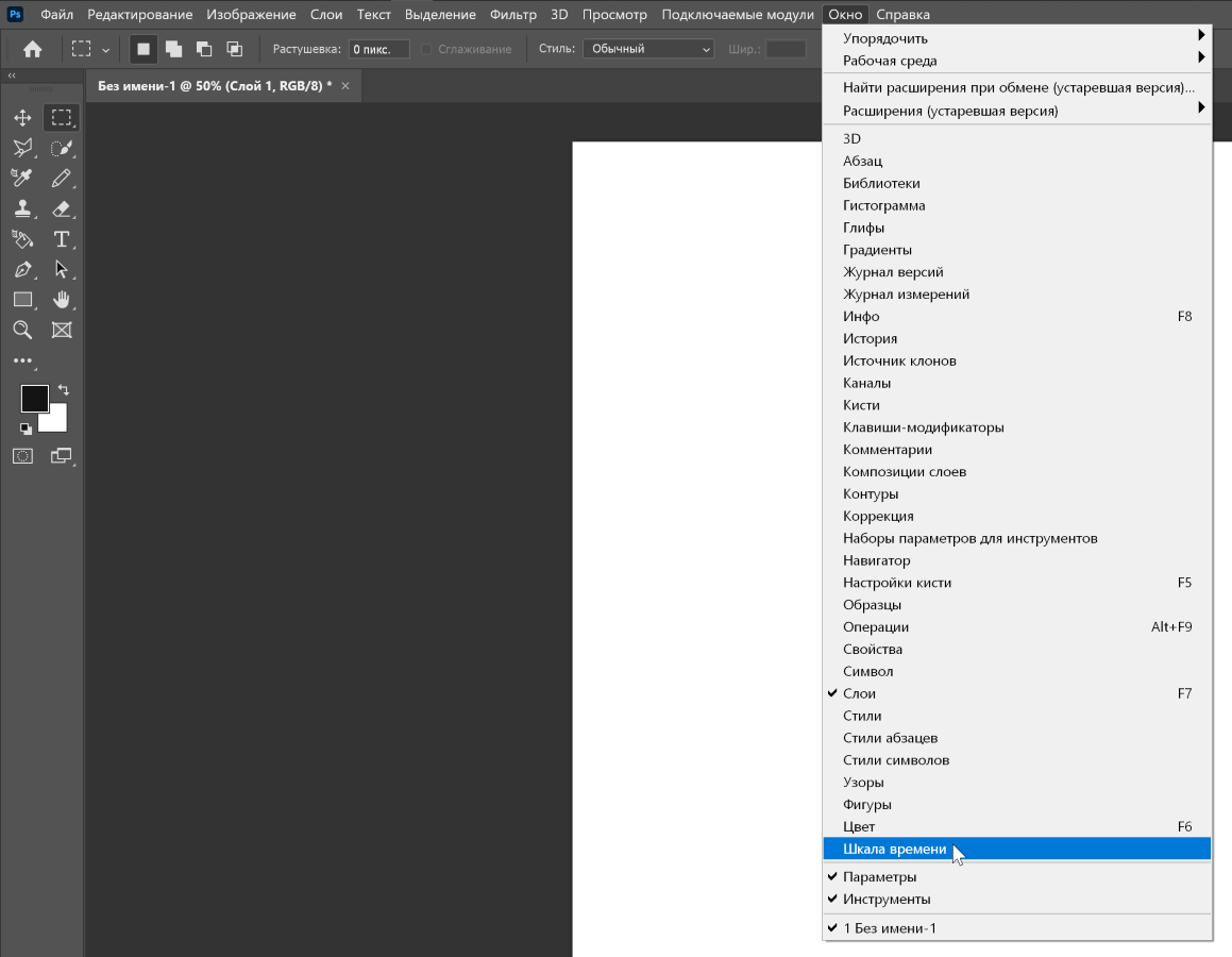 В верхней панели выбираем Window > Timeline (Окно > Шкала времени).