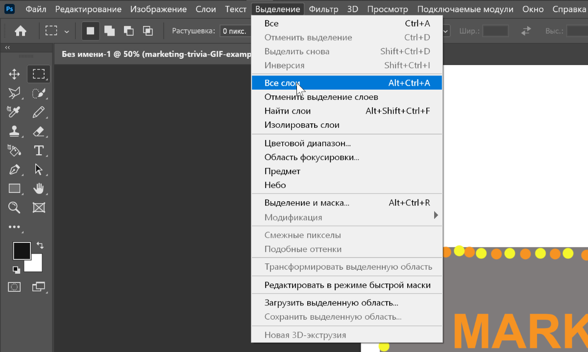 Для начала надо выбрать все слои, нажав в верхней менюшке Select > All Layers (Выделение все слои).