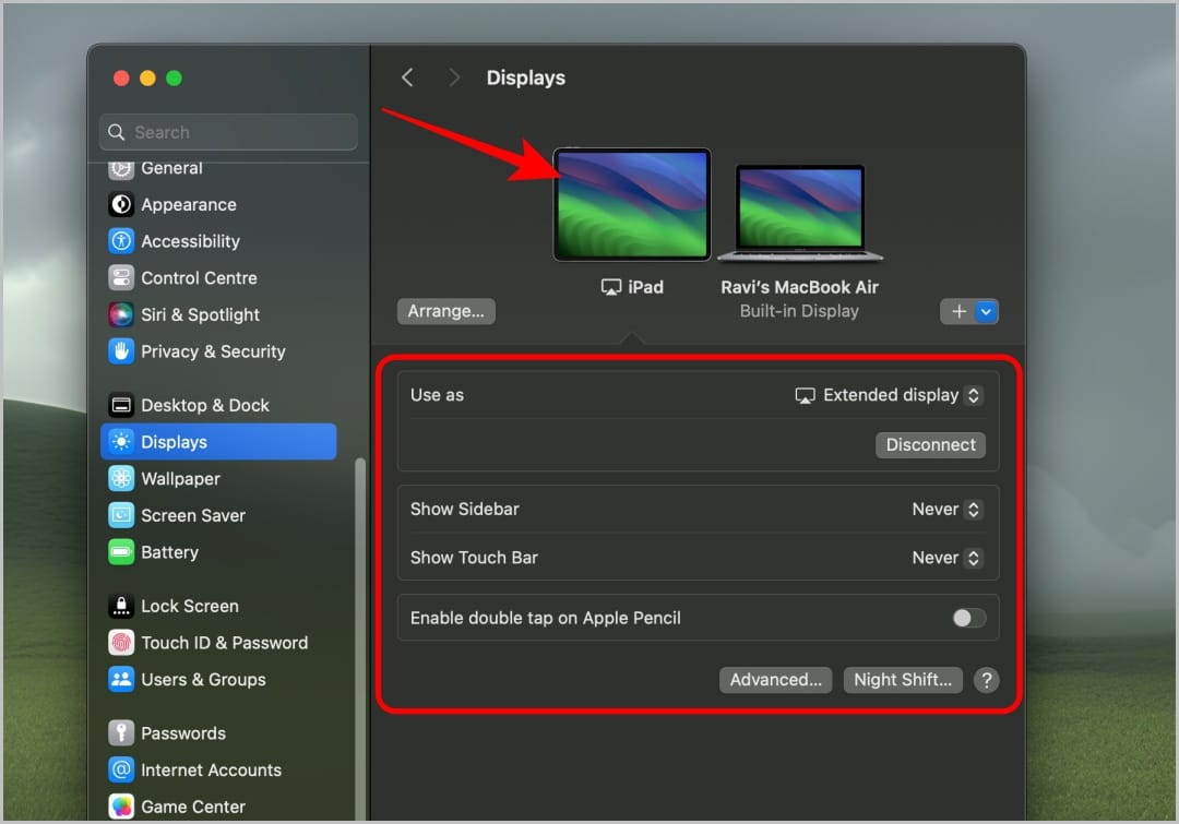 8. Чтобы совсем отключиться, откройте те же настройки дисплея и выберите опцию iPad. Нажмите на кнопку отключения, чтобы прервать соединение. Это также приведёт к закрытию приложения Sidecar на iPad.
